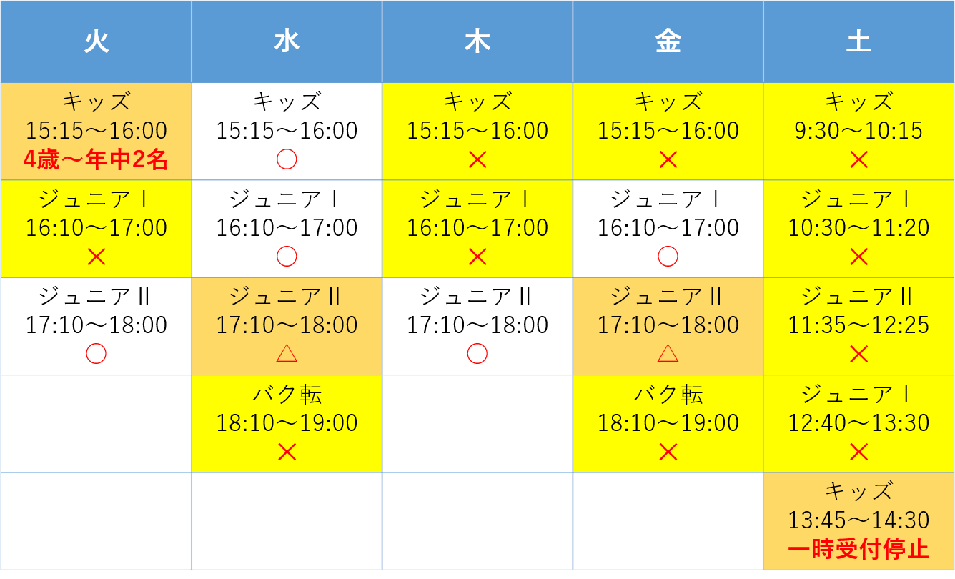 ✕の定員のクラスは、空きがでるまで体験は停止となります。
