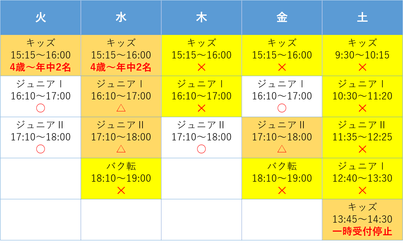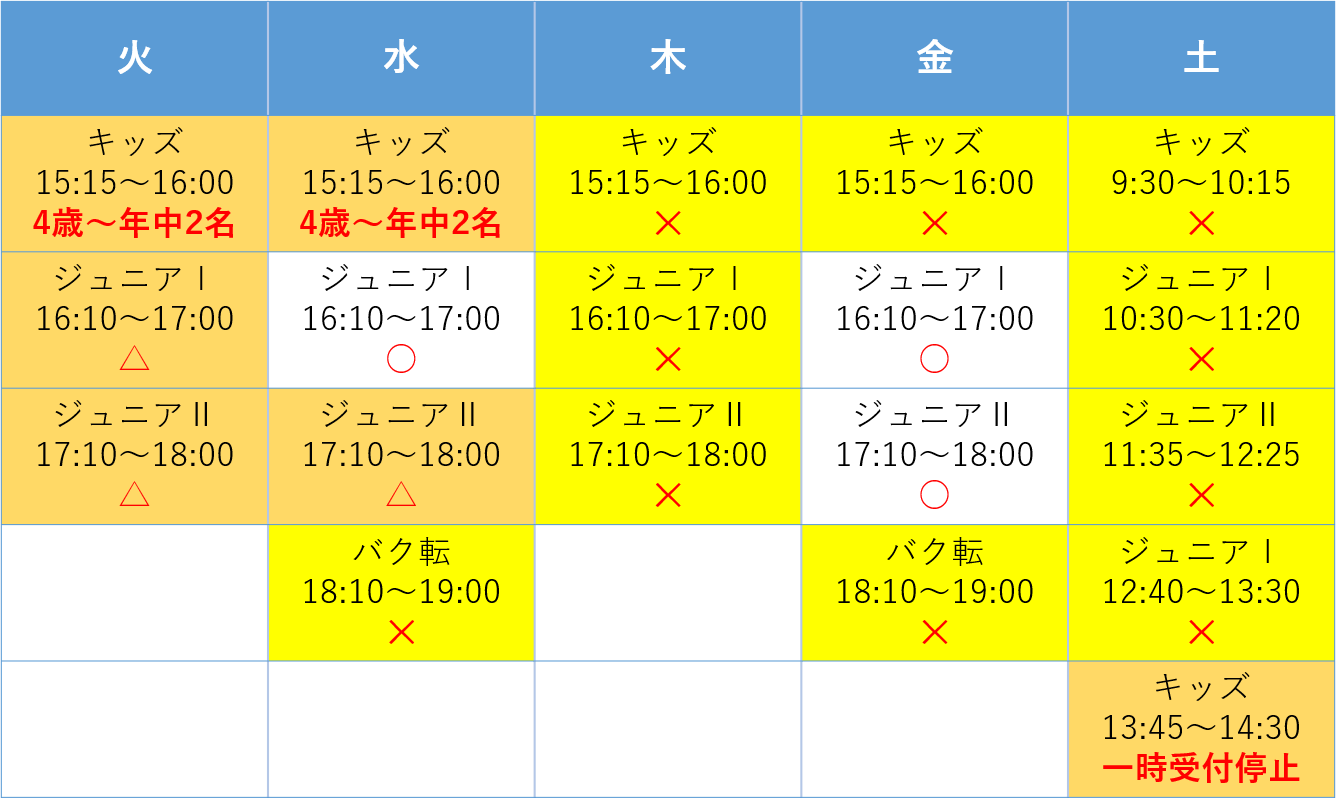 ✕の定員のクラスは、空きがでるまで体験は停止となります。